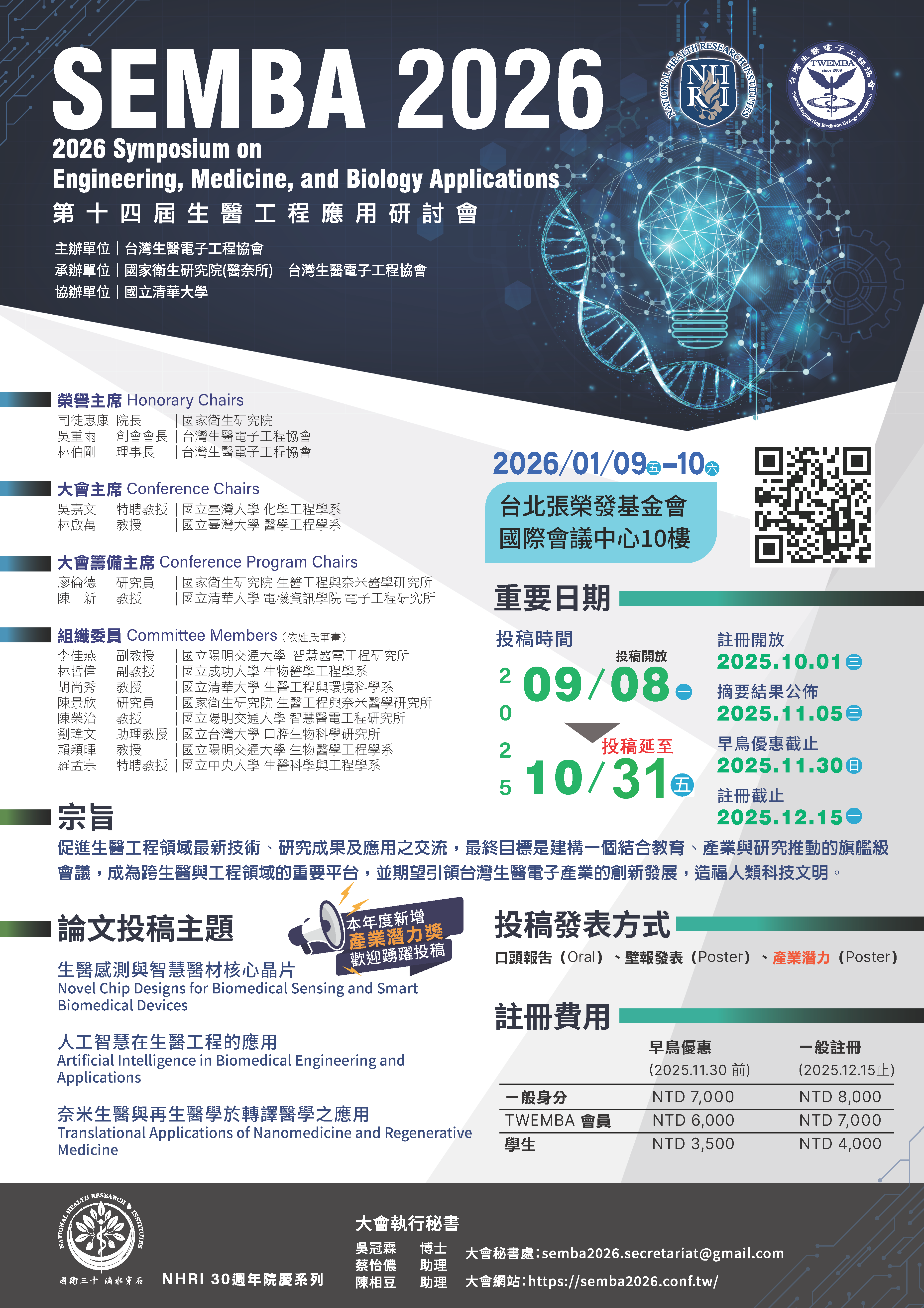 我們誠摯邀請您與會,並希望您能分享寶貴的研究經驗和見解,以啟發更多的學術討論。我們相信您的參與將為此次研討會增添光彩,並為生醫工程領域的進步做出重要貢獻。